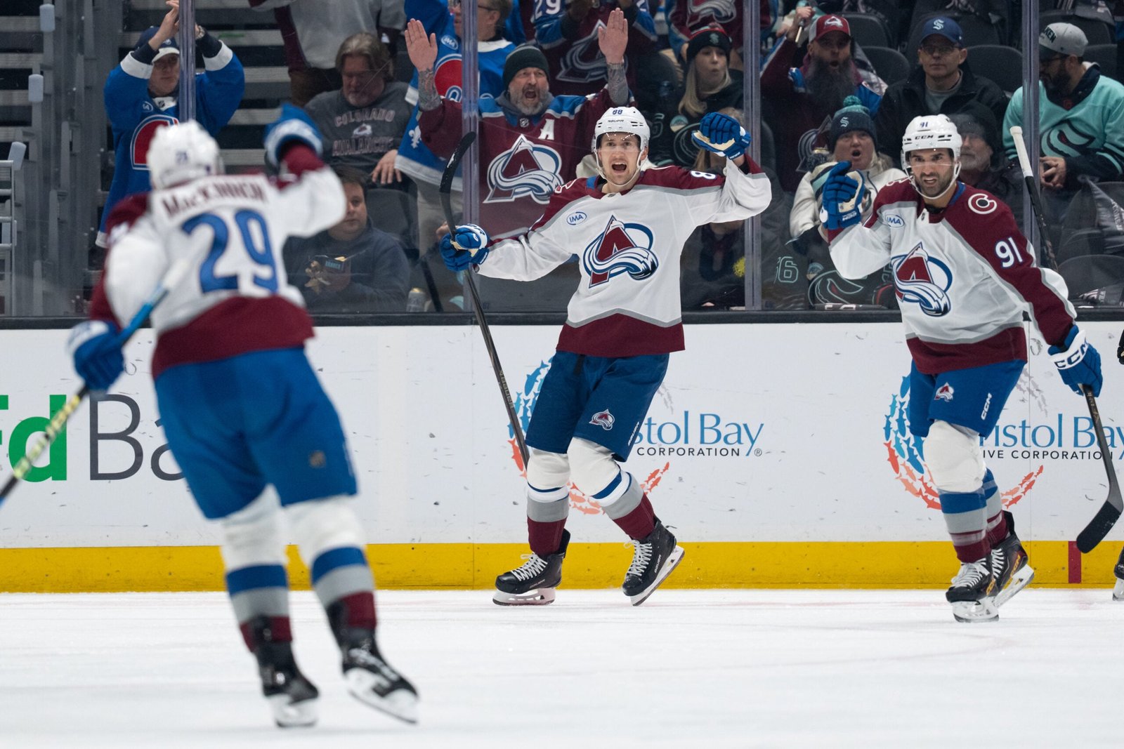 In total, MacKinnon has points in seven of eight, totaling four goals and 15 points in that stretch. He had a goal and three assists against the Kraken, effortlessly controlling the game with the puck on his stick.