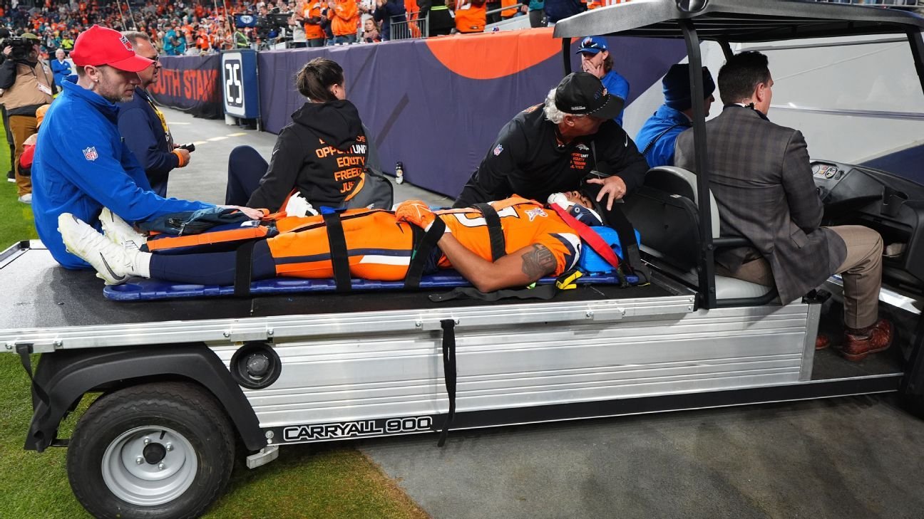 Bryant stayed on the field after the collision and was immobilized on a backboard by the Broncos’ medical staff. He was taken from the field on a cart and then went by ambulance to the hospital.