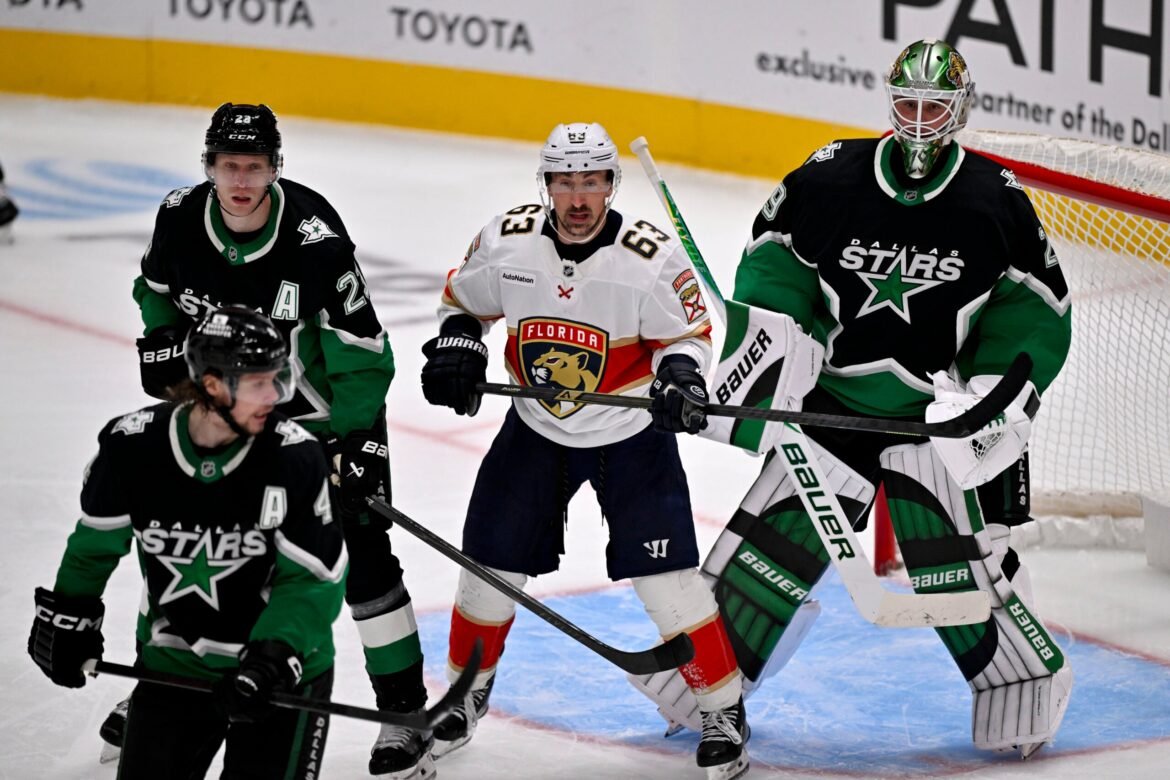 Florida Panthers left wing Brad Marchand skates between Dallas Stars defenseman Esa Lindell and goaltender Jake Oettinger (Jerome Miron-Imagn Images)