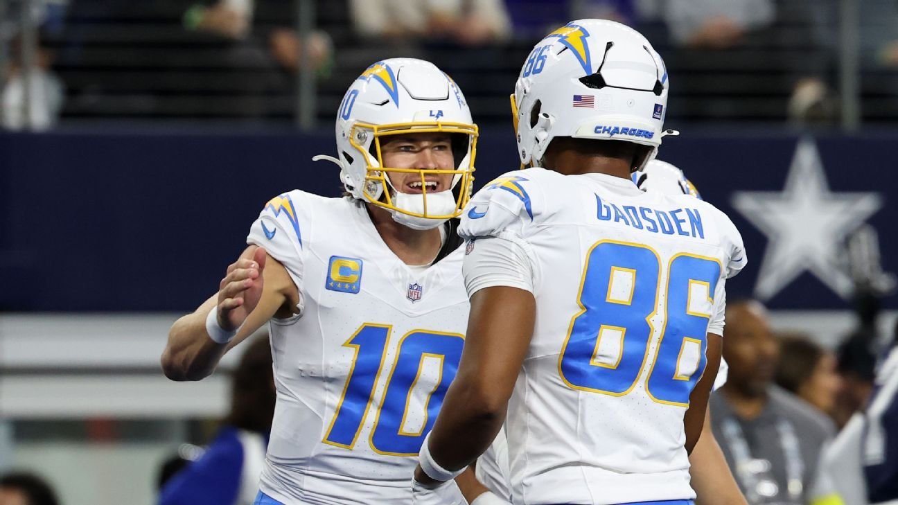 Los Angeles garnered 452 total offensive yards while its defense pitched a shutout in the second half. Chargers quarterback Justin Herbert threw for 300 yards and two touchdowns while rushing for a score on the ground. Sunday marked Herbert’s 31st 300-yard passing game — breaking a tie with Kurt Warner for the fourth most by a player in his first six seasons in NFL history, according to ESPN Research.