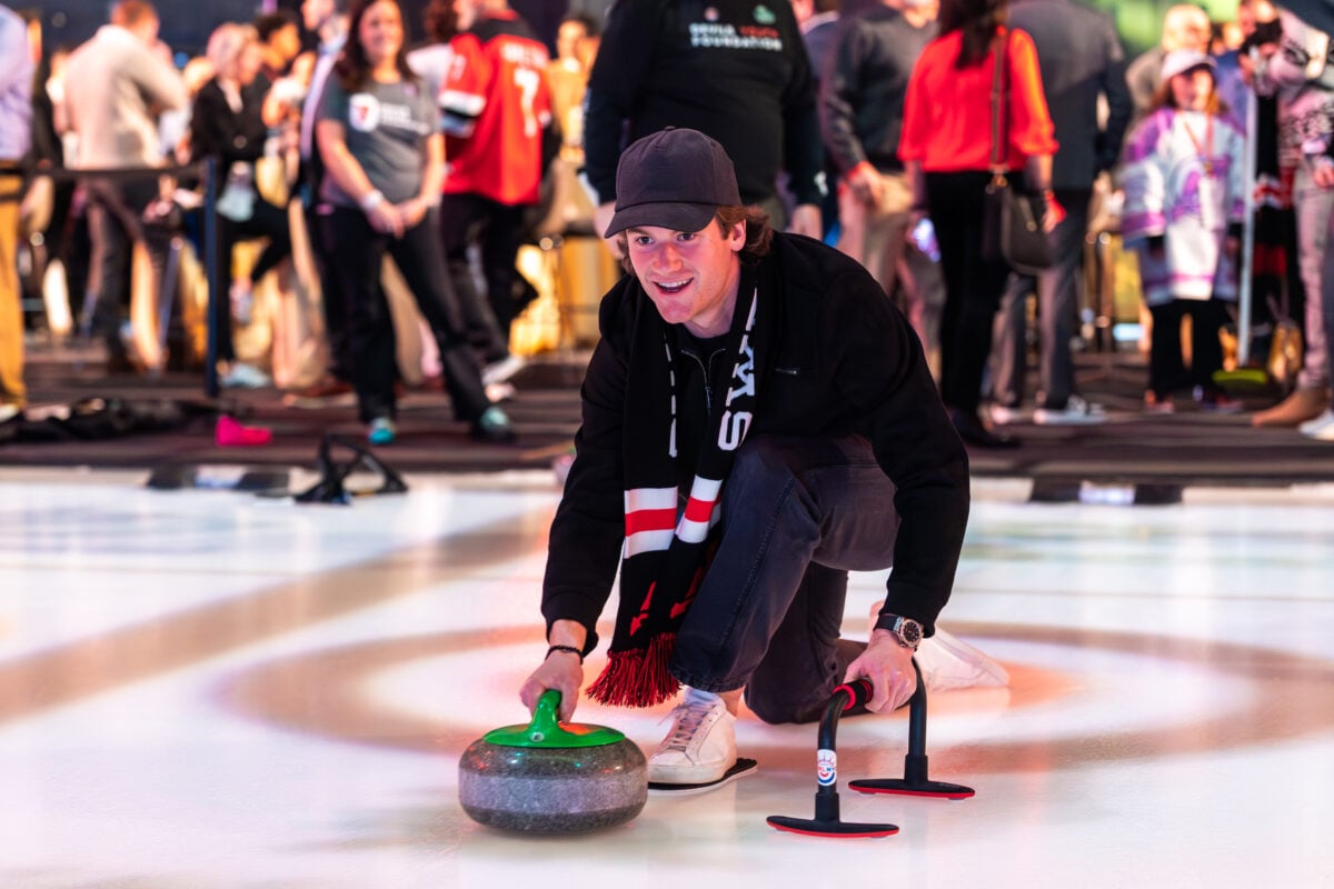 Dawson Mercer shows off his Curling skills at the Devils Sweep the Deck Gala. (Photo Credit: New Jersey Devils)