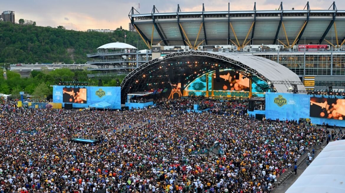 NFL commissioner Roger Goodell had told the rain-soaked fans outside Acrisure Stadium that Pittsburgh had set a record for attendance on Thursday and Friday, with more than 600,000 people packing themselves into the city’s North Shore and nearby Point State Park.