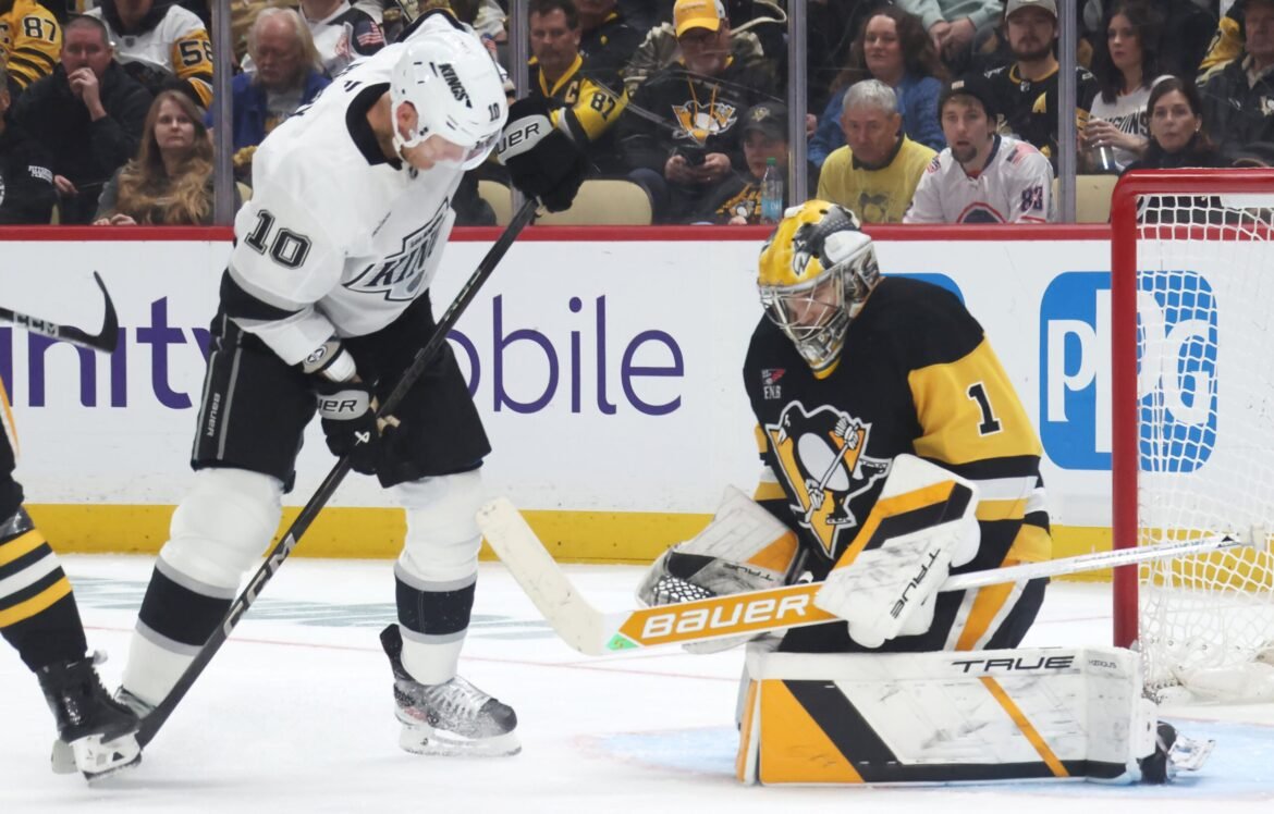 Pittsburgh Penguins goaltender Sergei Murashov makes a save against Los Angeles Kings right wing Corey Perry (Charles LeClaire-Imagn Images)